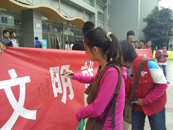 中午时分,社员们拉起“珍惜粮食,文明就餐,从你我做起”的横幅站在南二食堂门口,吸引了前往食堂用餐的同学们,大家纷纷驻足在横幅上签下自己的名字,这不仅是对爱心社活动的支持,更是他们对自己做出的“珍惜粮食 文明就餐”的承诺。同时,爱心社社员拿着精心制作的宣传单,不辞辛劳地奔走在几大食堂,向过往或正在就餐的同学宣传“世界粮食日”。尽管一直下着雨,打湿了社员们的衣裳,却丝毫没有浇熄他们的热情,社员们热情主动,同学们积极参与,活动持续了3个多小时,取得了理想的效果。