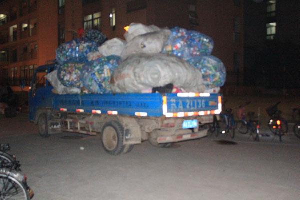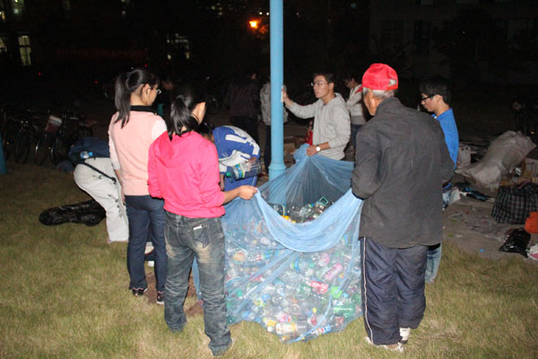 10月17日晚6点,爱心社成员在南二广场集合,按照事先安排,全体同学分组到各个宿舍楼扫楼,面向全校学生回收废品、旧物。尽管天气冷、工作量大,大家却丝毫不放松,热情询问同学们是否有废旧物品需要捐赠并向他们解释收旧的目的。在各寝室楼回收结束之后大家满载而归地把“战利品”就近送到了事先指定的集合地点。在集合地点大家对各类废旧物品进行分类整理,清点个数。