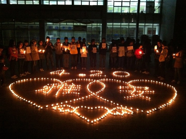 8点半活动正式开始,社员们肃穆的点燃了广场上由蜡烛摆成的心形和平安字样,邀请路过的学子举着“情系雅安,我们在一起”的字牌一起为雅安的同胞们祈福。与此同时,爱心社的社员们还伴随着《爱因为在心中》的音乐,用手语来表达自己对受难人们的祝愿,在场的诸多学子在此刻心中都默念着两个字——雅安。