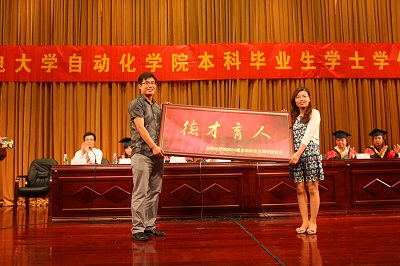 在激昂的国歌声中,学士学位授予仪式正式拉开帷幕。首先,副校长王国平教授深情致辞,他以“做人要知足,做事要知不足,做学问要不知足”来告诫同学们要和气做人,常怀感恩之心,做事要大气,无论何时都要不忘学习。即使现在同学们离开了校园,但母校也永远是大家最坚强的后盾、最温暖的港湾。院长王保云教授在致辞中充分肯定了2010级学生四年来取得的成绩,感谢同学们对学院的发展所做出的努力,并提出了两点希望:一要志存高远,心怀宽广;二要不断学习,勇于创新。随后,教师代表吴复霞老师为毕业生送上了美好的祝福,她衷心地希望同学们在以后的人生道路上保持积极乐观、豁达平和的心态,以一颗平常心看待生活中的荣辱得失,积极面对人生中的一切。毕业生代表武芝慧同学在发言中提到,大学四年的感情叫做陪伴,而母校则成了她努力向前的动力。不论今后的路是怎样的,母校永远都是大家心中的挚爱。接着,毕业生代表上台给学院赠送了一块写有“德才育人”的牌匾,表达全体毕业生对学院的感恩之情。最后,由导师为2014届毕业生颁发学位证书并拨流苏。至此,大会圆满落幕。