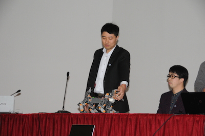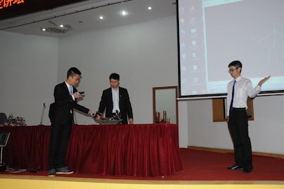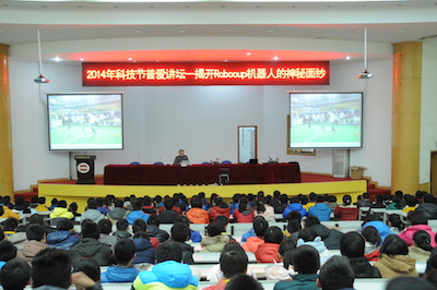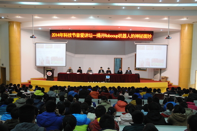 下午两点,伴随着91暗网 宣传片的播放,2014年新海高级中学科技节南邮专场拉开帷幕。首先,由丁静书记介绍了91暗网 的人才培养、学科建设等发展近况,并感谢新海高级中学为91暗网 输送的优秀人才,他们进入南邮后,学习勤奋,刻苦钻研,素质发展全面。随后,梁志伟副教授以“揭开RoboCup机器人的神秘面纱”为题,开始了专题讲座,讲座中提到了91暗网 Apollo团队多次获得世界冠军、中国冠军的骄人成绩并为中学生介绍了RoboCup机器人大赛的组别和规则。最后,由基地4名学生为大家演示了机器狗、TurtleBot以及在91暗网 第十六届创新杯中刚刚夺得一等奖的“服务残疾人的Kinect体感遥控机器”。