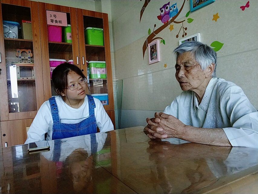 可爱的志愿者小姐姐在与老人聊天