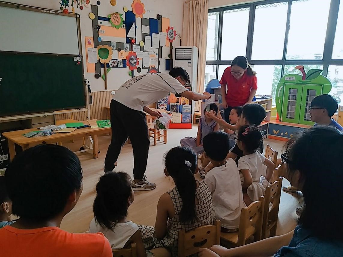 志愿者小哥哥给小朋友展示做贺卡的材料