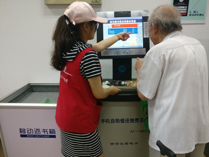 志愿者引导老人使用自助借还缴费机