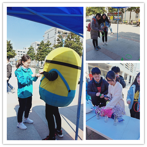 活动一开始,小黄人和熊本熊的糖果大放送便吸引了众多同学的目光,大家纷纷停下忙碌的脚步来参加小游戏——爱的魔力套圈圈,参与者手持三个圈圈,套中即得,即便没能套中礼物也可以获得一张情话满满的小情书和暗藏大奖的刮刮卡。呆萌可爱的公仔、精致浪漫的干花、美观实用的帆布包以及揭开纸片发现的惊喜都给同学们带来了属于女生节独一无二的快乐。她们欢快的笑声,给女生节增添了更多的温馨与幸福。