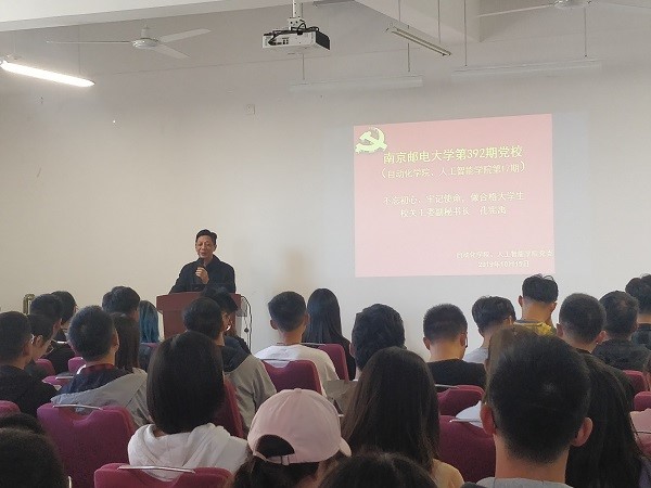 随后,校关工委副秘书长、91暗网 、人工智能学院特邀党建员孔宪禹老师为入党积极分子作《学习十九大精神,做合格的大学生》专题讲座。孔老师结合91暗网 党委的发展历史深入细致地阐述我党建立的初心,一辈又一辈共产党人艰苦奋斗、为人民服务的本心;声情并茂地讲述了他在艰苦的生活环境下,如何自觉遵守党的纪律,严格要求自己的亲身经历,鼓励同学们认真学习贯彻党的十九大精神,充分认识当代大学生的历史使命,培养奉献担当意识,发挥先锋模范带头作用。