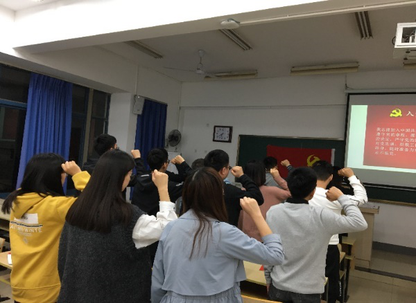 会议的最后,党员佩戴党员徽章,面对鲜红党旗,重温入党誓词。整场宣誓庄严而隆重。