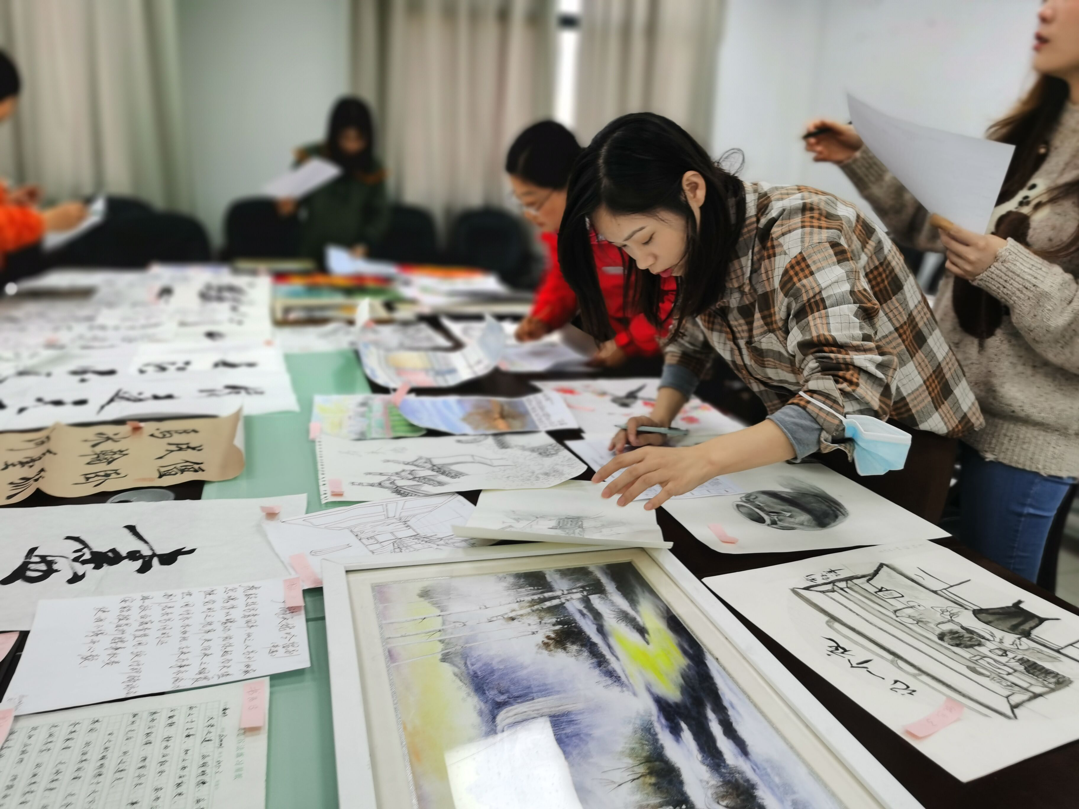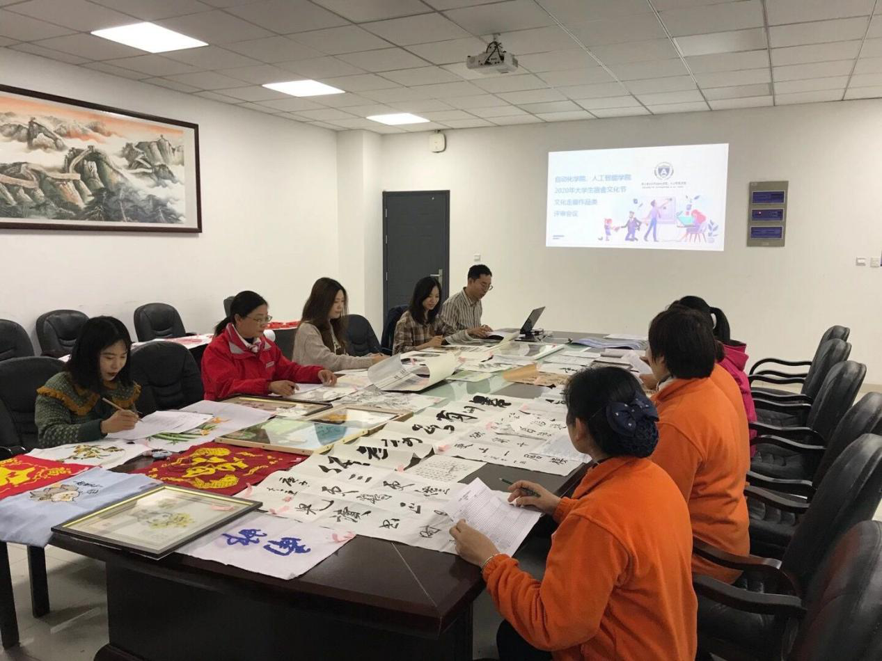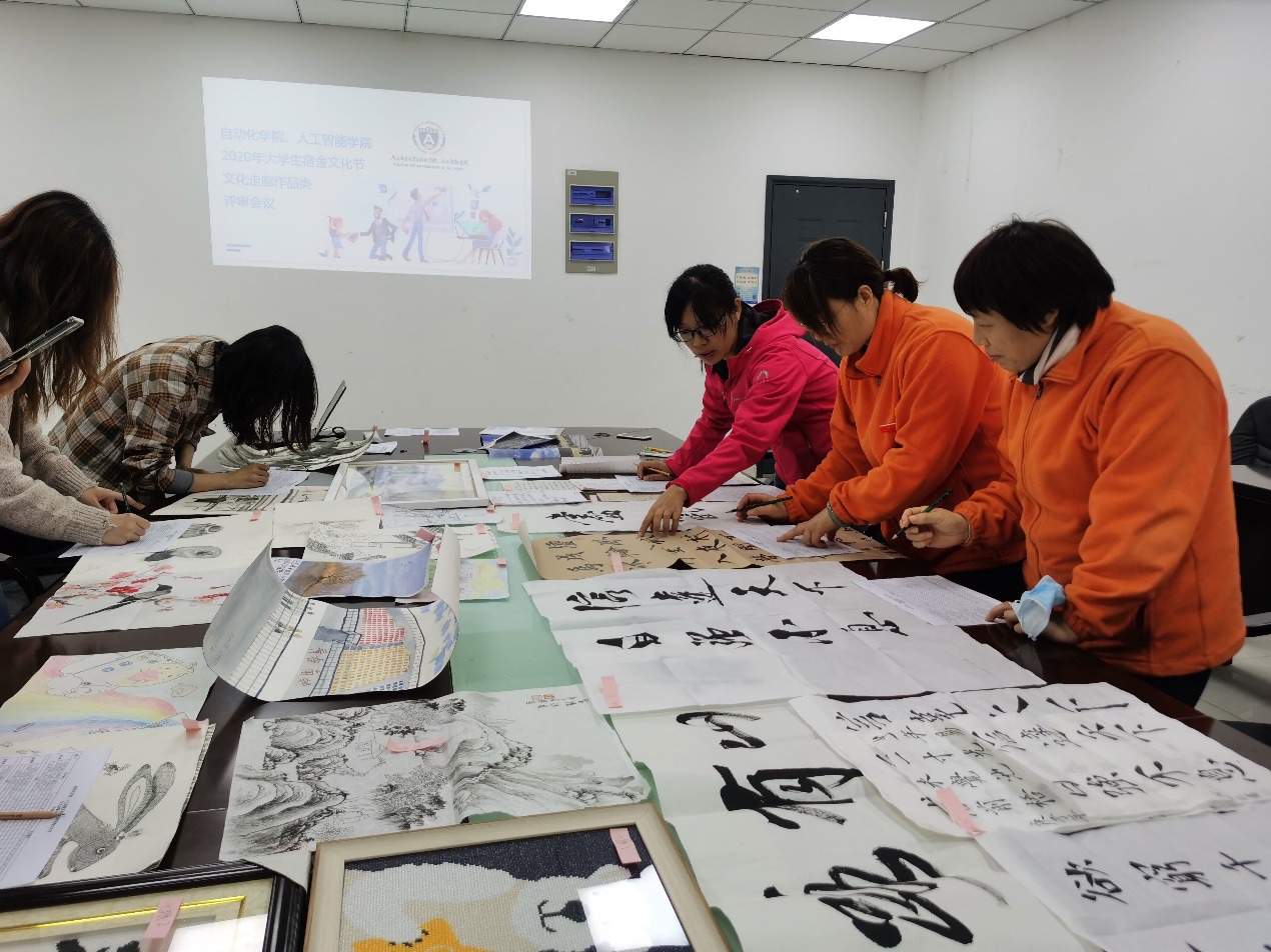 首先,吴鹏老师为参加评审会的评委介绍本届宿舍文化节提交的作品情况,让评委们对作品有了初步的了解。接着,通过屏幕浏览摄影作品的方式,各评委对大屏幕上逐一展示的作品进行打分。随后,评委们在对作品创意、艺术性、作品内容所反映出的南邮生活气息等多方面斟酌后,分别对书法、绘画作品、剪纸、十字绣作品进行打分。