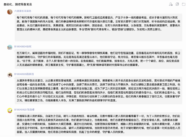 2018级团支部,以预备党员、入党积极分子为表率,积极组织发动广大团员,学习观看卫国戍边英雄事迹,谈体会,写感悟,利用线上平台广泛开展讨论交流。