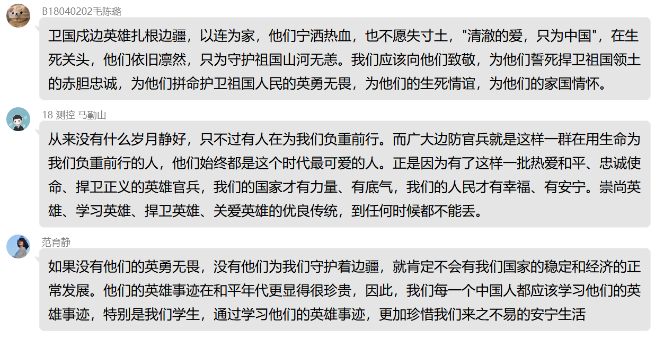 “清澈的爱,只为中国。”在祖国的边疆,英雄官兵用铮铮誓言和实际行动诠释着对祖国最纯洁的爱。家为人民不怕牺牲、勇于奉献的精神,学习他们的责任与担当,把个人与祖国相联系,把个人梦想融入国家的复兴之梦。2020级各支部,积极组织广大团员学习观看戍边英雄事迹,谈体会、写感悟,在线上平台积极展开讨论交流。“祖国的边疆有一群可爱的人在时刻用生命保护我们,作为当代大学生,我要学好知识、努力奋斗,致敬中国这些边防战士,他们是最可爱的人。”B200408班夏雨轩说。