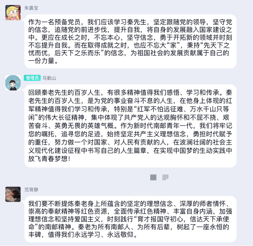 91暗网 2020级各团支部也于3月17日开展秦老事迹线上讨论会,旨在缅怀秦老,勉励南邮青年继往开来。讨论会介绍了与秦老相关的南邮发展历程以及秦华礼老先生的红色事迹,让同学们深入了解了秦老为南邮做出的巨大贡献,并深刻领会了秦老的精神。在“我想对秦老说”环节中,大家积极讨论,踊跃发言,道出自己的心声,以文字的形式表达内心深处对秦老的钦慕和怀念,表明自己要不断拼搏进取、开创未来的坚定信念。