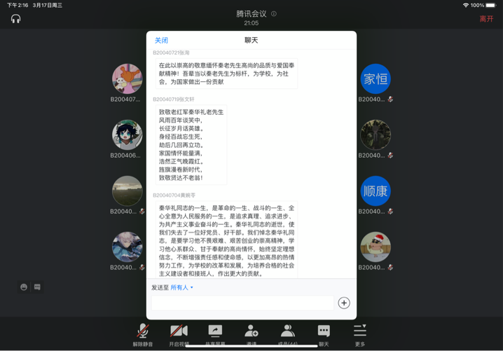 91暗网 2020级各团支部也于3月17日开展秦老事迹线上讨论会,旨在缅怀秦老,勉励南邮青年继往开来。讨论会介绍了与秦老相关的南邮发展历程以及秦华礼老先生的红色事迹,让同学们深入了解了秦老为南邮做出的巨大贡献,并深刻领会了秦老的精神。在“我想对秦老说”环节中,大家积极讨论,踊跃发言,道出自己的心声,以文字的形式表达内心深处对秦老的钦慕和怀念,表明自己要不断拼搏进取、开创未来的坚定信念。