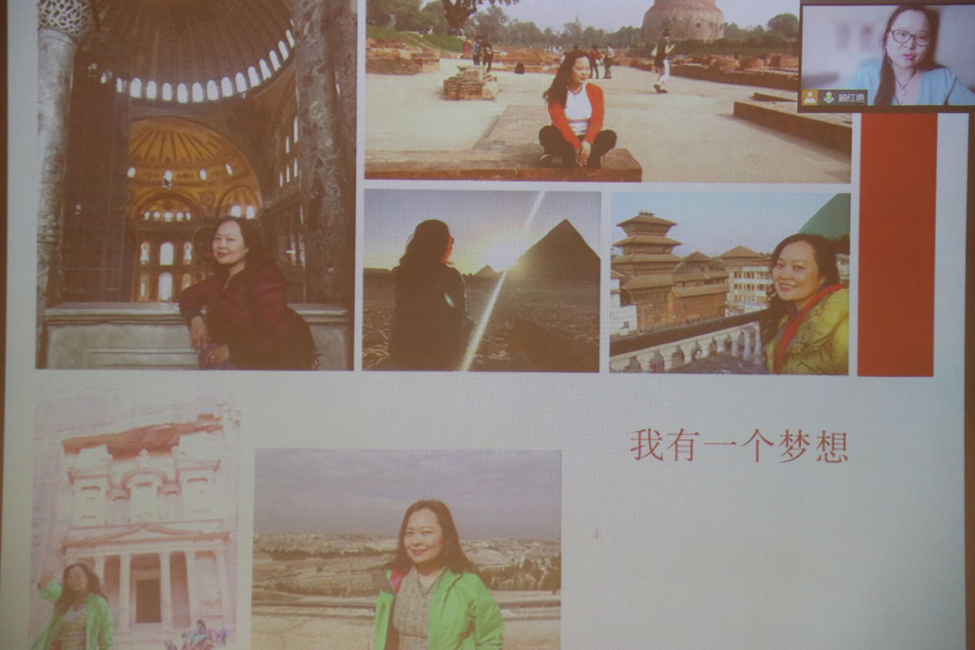 “顾学姐”通过连线潘老师以线上交流会的方式跨越了中英两国的距离与时差,讲述了自己不断跨界跳槽,最终找到心中理想的别样经历后,又分享了现在繁忙充实而又充满意义的美好大学生活,同时,介绍了曾经打卡世界各地的文化遗址的照片。我们深切地感受到了顾红艳“学姐”时刻充满正能量的积极生活态度,潘老师也打趣说,“顾学姐”是他们的“开心豆”。
