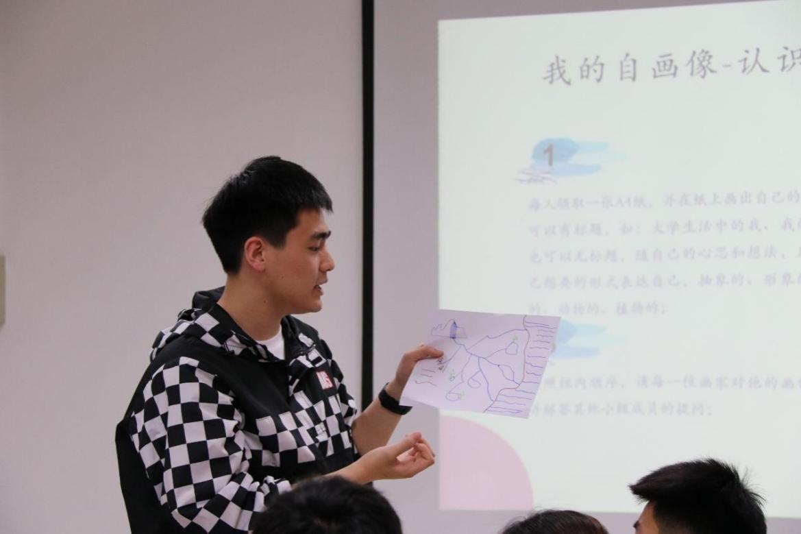 活动最后一个环节——我的自画像,大家拿起彩笔,在画纸上画出任何可以表达自己的东西,通过交流探讨,同学们直观了解到无论是抽象、形象,无论是人物、植物,都是内心世界的真实表达,都能从不同的侧面反映多样的心理状态。