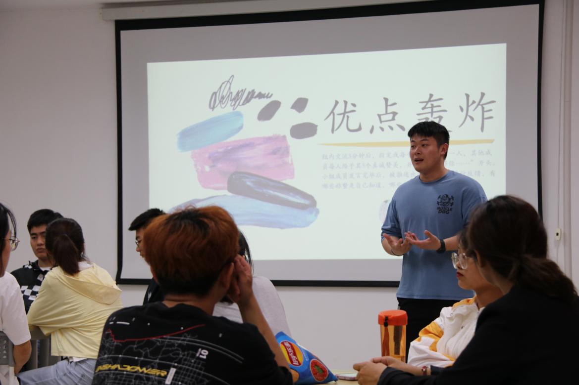 接着,培训第二个环节——优点轰炸,每个小组选出一名被“轰炸”的对象,其他成员每人给予其3个真诚赞美,并以“我觉得你……”开头。在小组成员“轰炸”优点完毕后,被“轰炸”的同学对大家的评价予以反馈,在这个环节中,无论是被夸的同学,还是夸别人的同学,都体会到了称赞的力量,这也是作为心理委员开展心理工作时的沟通技巧和有效手段。