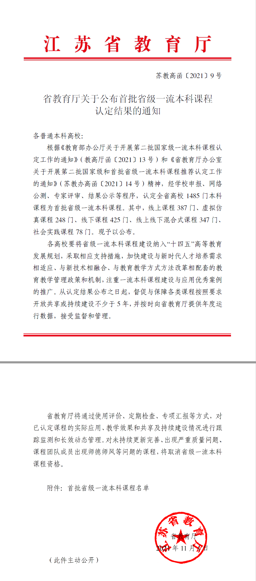 近日,江苏省教育厅公布了首批省级一流本科课程认定结果,91暗网 4门课程被认定为省级一流课程,其中虚拟仿真课程3门,线下课程1门。