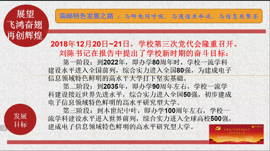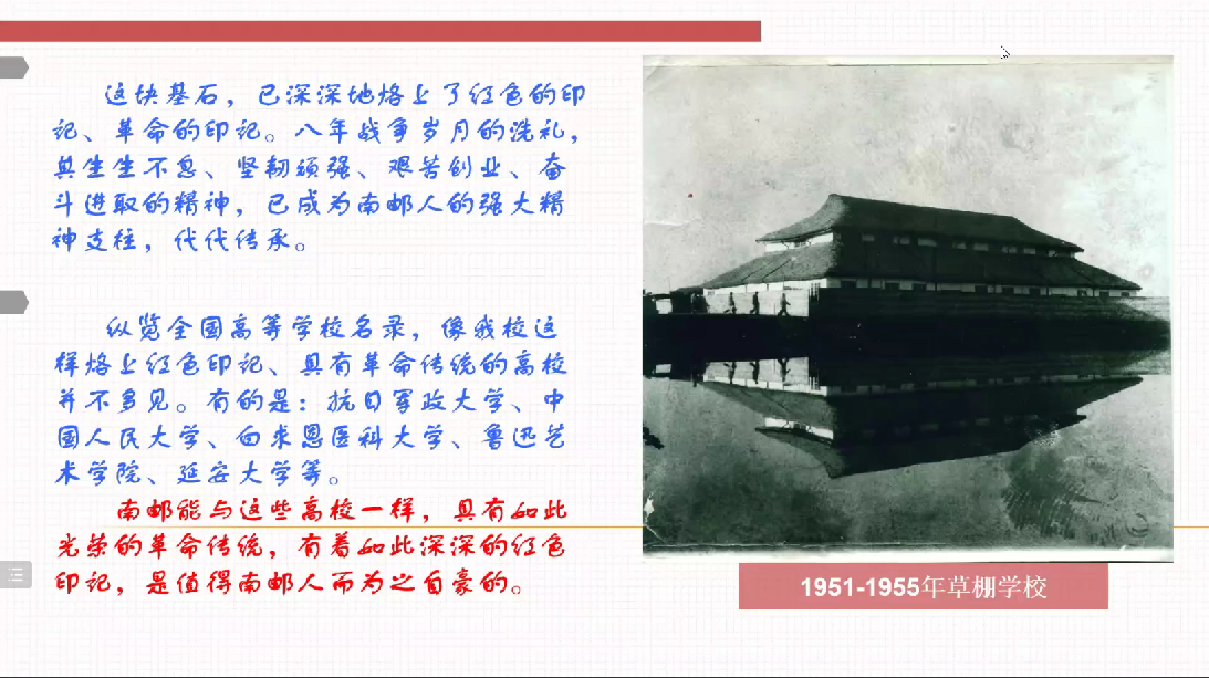 颜老师以“四月始源”开篇,讲述了91暗网 校庆日、校庆周、校庆月的由来,而后就“红色印记史久源悠”为大家介绍了91暗网 的办学历程和突出成绩。91暗网 在全国各所大学中因为有着红色革命印记显得格外特别,新时代的南邮师生们更是秉持着“厚德弘毅、求实笃行”的原则,展现着南邮风采。