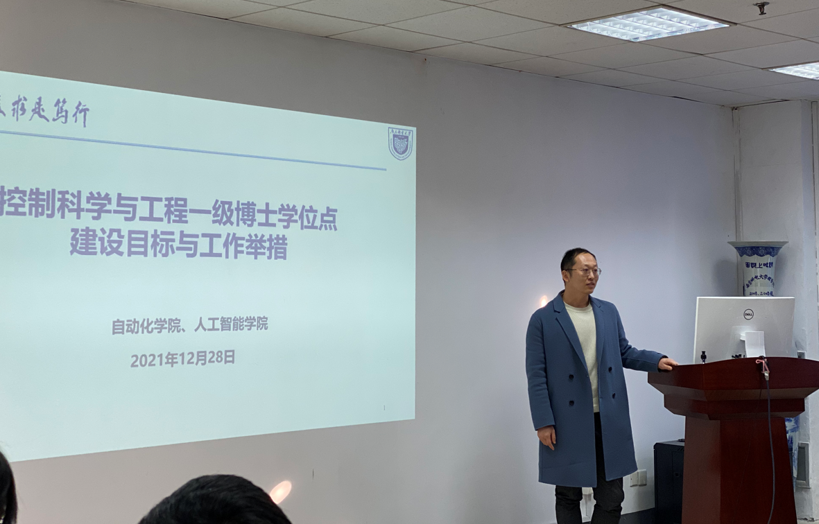 组织部副部长、人事处副处长,学院原副院长张腾飞从学科发展与建设和一级博点申报工作两方面对控制科学与工程学科的发展历程进行回顾。副院长丁磊从学科整体、科学研究、人才培养、师资队伍四方面明确博士点建设目标,并从平台建设、人才培养、成果转化、科技创新、国际合作五个方面出发,梳理建设思路,明确建设举措。