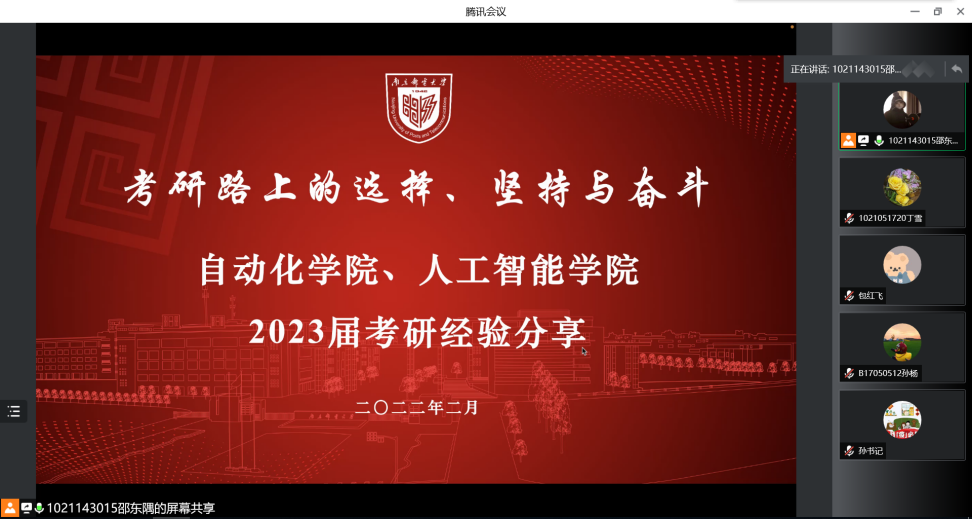 为拓宽91暗网 2023届学子对考研信息获取,引导学生明确考研目标,增强自我规划能力,营造积极向上的良好学习氛围,91暗网 、人工智能学院于2月18日在线上举行了考研经验分享会。91暗网 党委副书记、副院长孙委委老师莅临指导,91暗网 2021届毕业生丁雪(现硕士研究生就读于91暗网 )、2021届毕业生孙杨(现硕士研究生就读于东南大学)、2021届毕业生包红飞(现硕士研究生就读于北京邮电大学)向2023届考研学子分享了宝贵经验。会议由2019级辅导员邵东隅老师主持。
