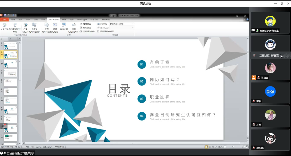郑鑫浩学长则结合自身的经历,从简历制作、职业选择以及非全日制研究生认可度等方面进行了详细的分析和讲解。他针对简历制作、求职、面试经验等方面提出了很多中肯的建议,并在确定就业方向方面提供了宝贵的意见。