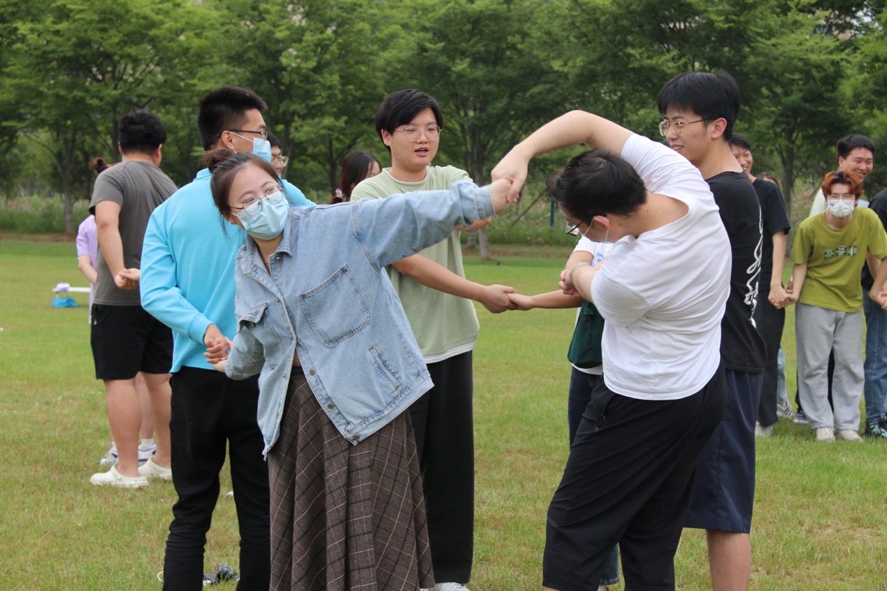 破冰之后,通过“大象摸鼻转圈”“解手绳”等一系列热身活动,让同学们舒缓压力、放松身心,愉快地参与到活动中来。