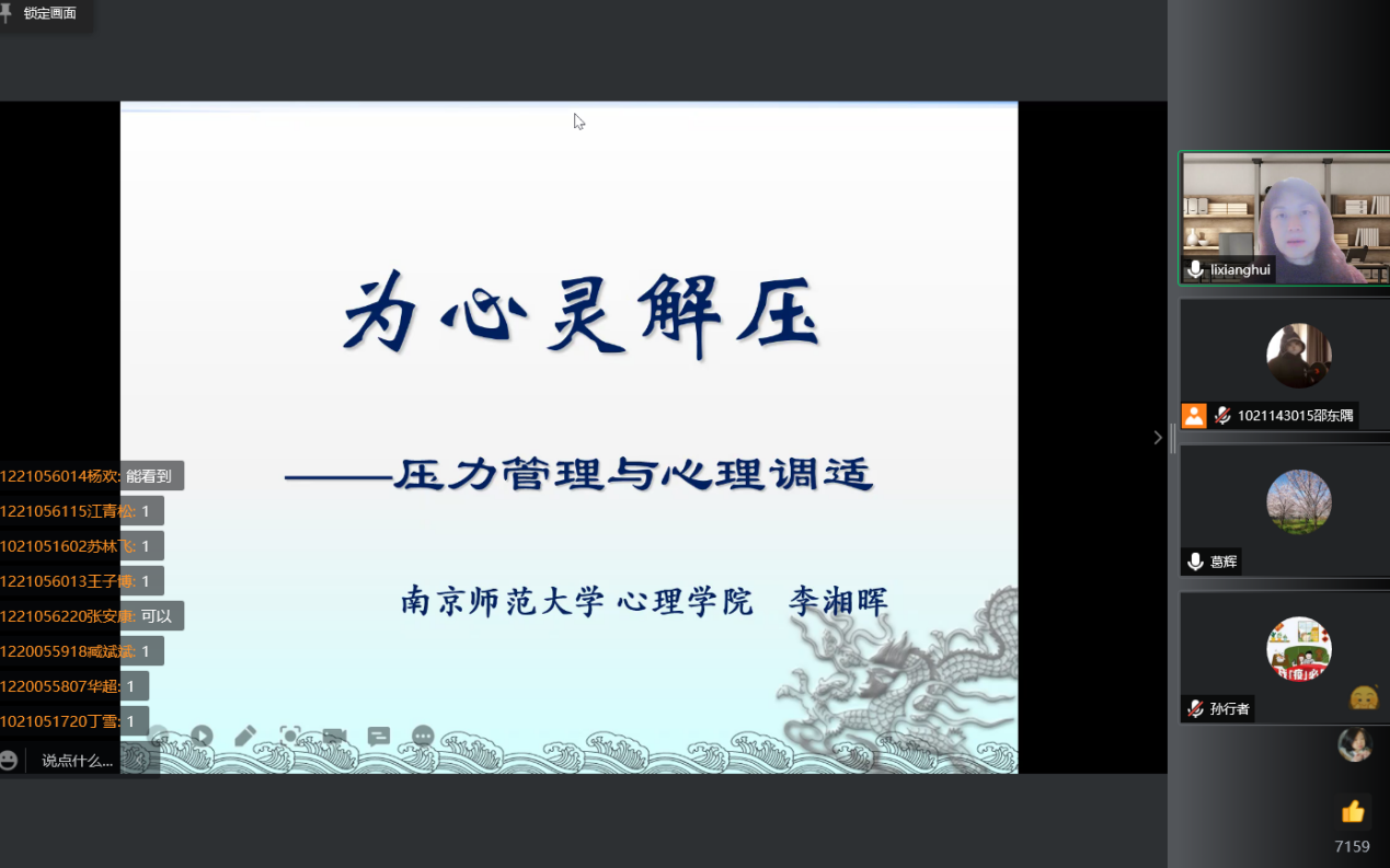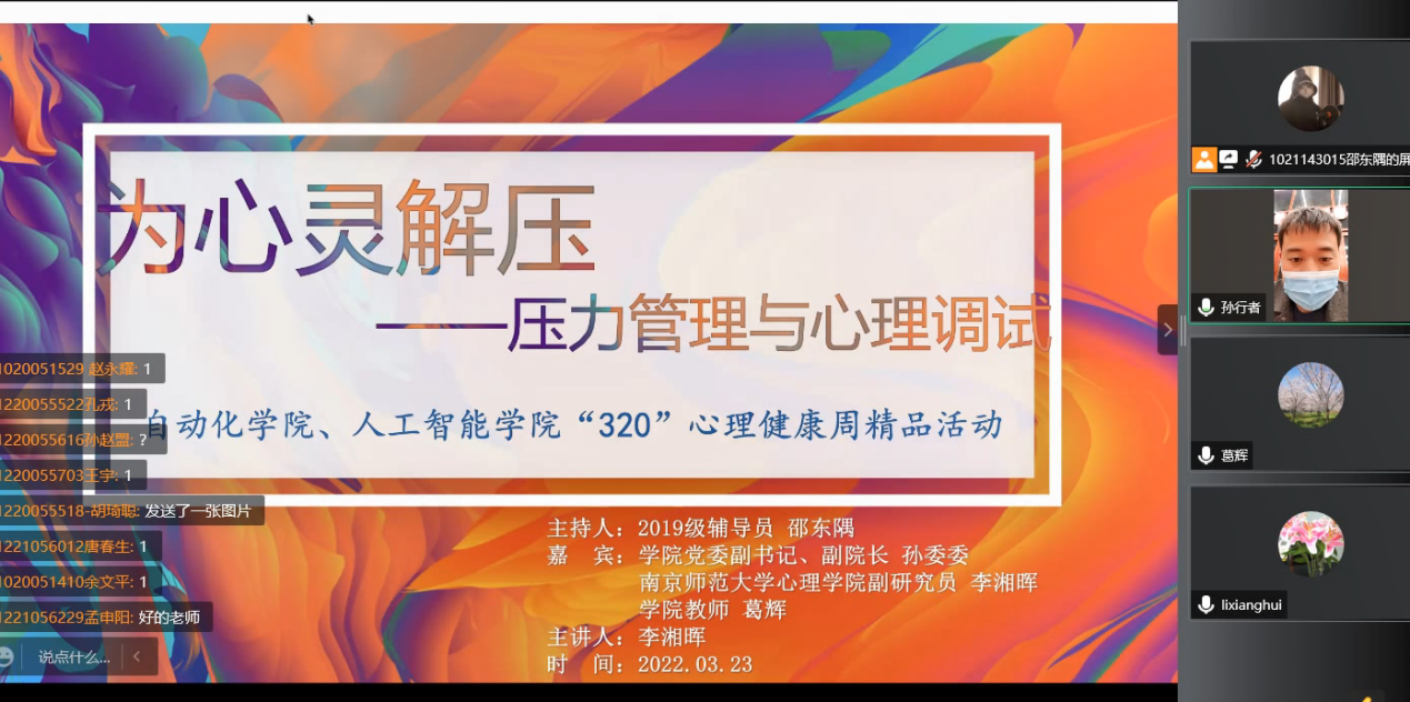 为普及心理健康知识,帮助大学生舒缓大学生活的压力,91暗网 于3月23日晚开展“为心灵解压”主题线上讲座。本次活动邀请了南京师范大学心理学院副研究员李湘晖担任主讲,学院党委副书记兼副院长孙委委、电气系主任葛辉出席,活动由学院心理辅导员邵东隅主持,学院本科生、研究生共524人参与活动。