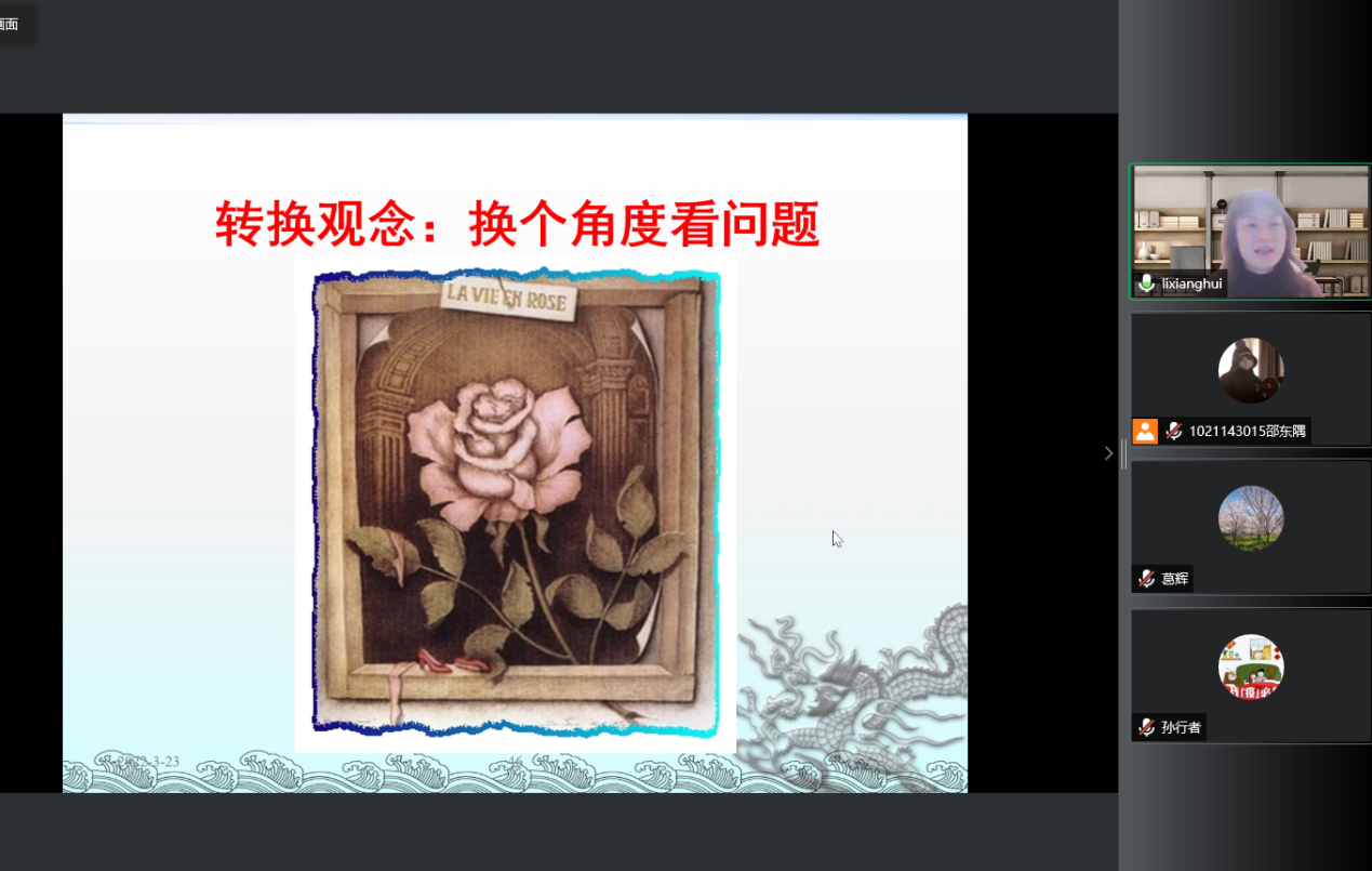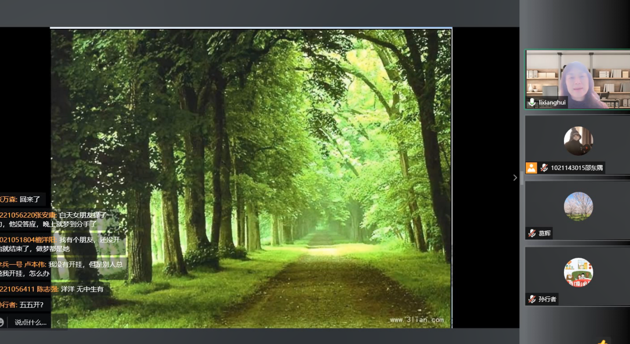 随后,李湘晖老师作为主讲人介绍了压力的定义,从社会因素、职业因素、家庭因素、个人因素阐述了压力产生的原因。用一张林间绿荫小道的图片,让同学们进行放松训练,同学们在讨论区踊跃留言,纷纷表达自己做完训练后的感受,提出自己的疑问和忧虑,李老师也一一耐心解答。李老师还引用“哭婆”的故事和ABC理论,鼓励大家努力寻找快乐的积极意义。无论是平时还是“疫情横行”的当下,都要快乐地面对生活,及时调整情绪,将压力转换为动力。