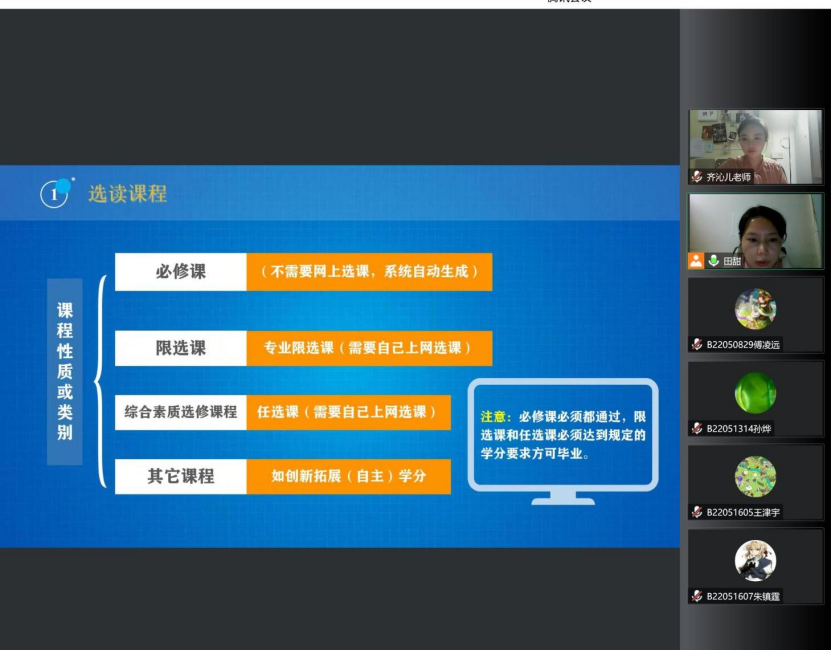为帮助2022级新生了解学籍相关政策与教学相关的管理规章制度,在教务处学业指导中心的指导下,91暗网 于10月19日14:00、19:00举行2022级新生学籍政策宣讲活动,两次宣讲会由教务处田甜老师担任主讲,新生辅导员和全院2022级新生线上参加会议。