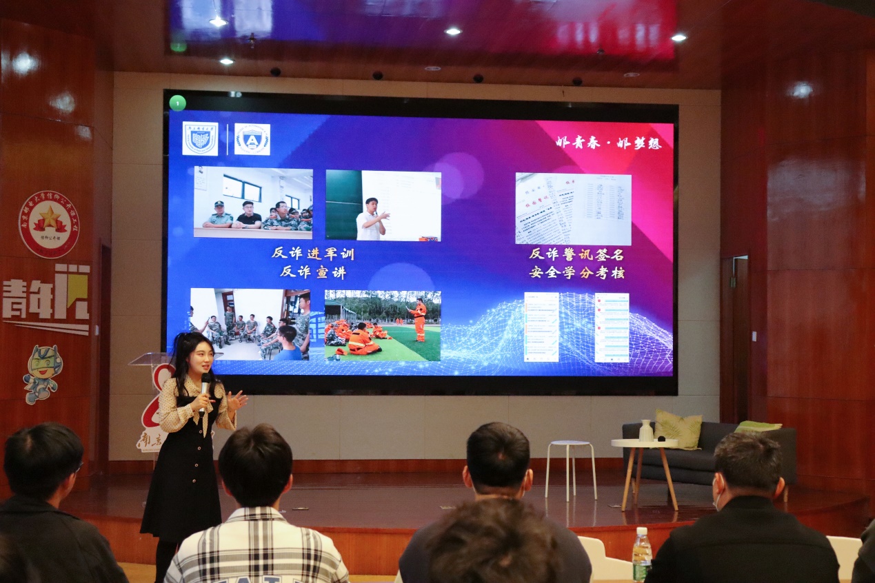 最后,胡圣永、张博文、娜孜叶尔克、杨玉满四位同学为大家倾情献唱了自编防诈主题歌《反诈阵线联盟》,瞬间点燃全场。