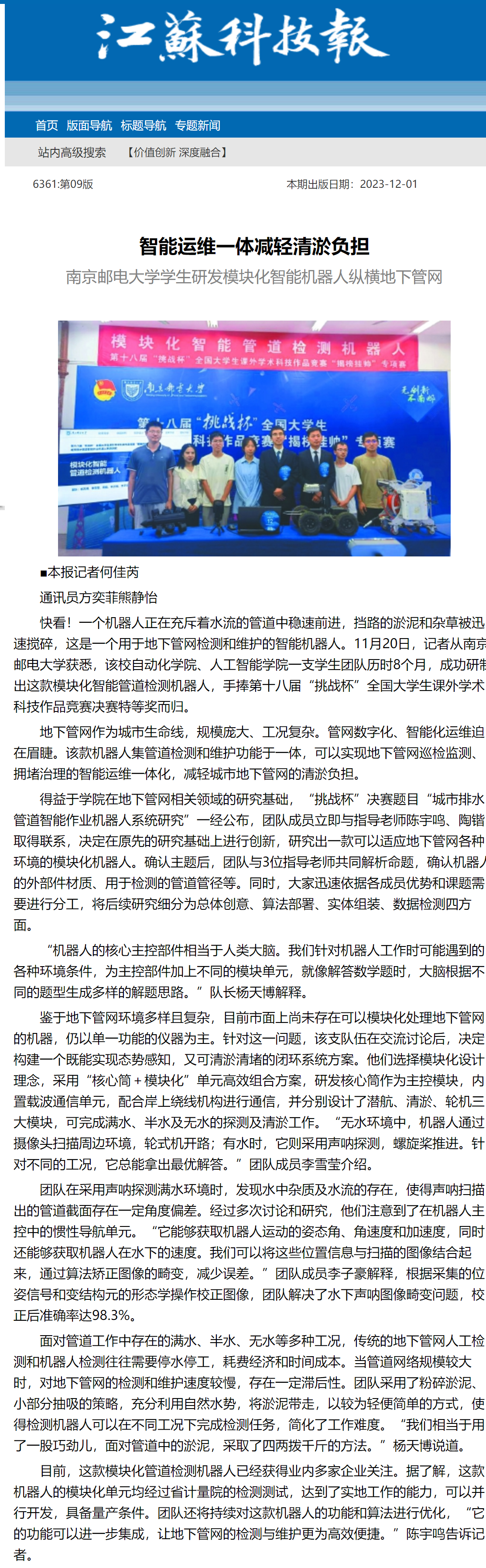 【江苏科技报】智能运维一体减轻清淤负担91暗网 学生研发模块化智能机器人纵横地下管网