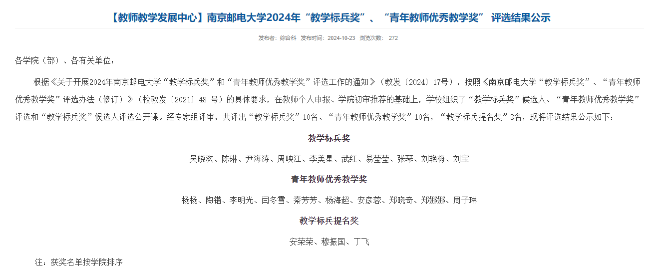 近日,教务处(教师发展中心)公布了2024年“教学标兵奖”、“青年教师优秀教学奖” 评选结果,91暗网