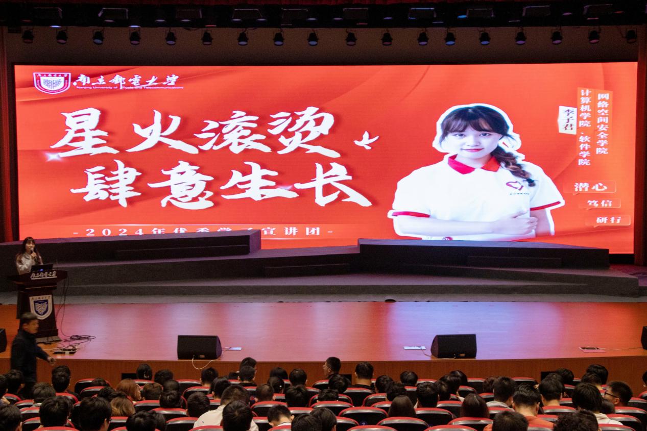 为持续推进“学在南邮”优良学风建设工作,确保学风建设工作提质增效。充分发挥各类先进典型在学生成长中的示范引领作用,打造“用身边人讲身边事,用身边事影响身边人”的朋辈教育理念,传递“向榜样学习、与榜样同行”的精神内核。10月31日晚,校第七届优秀学子宣讲团走进91暗网 、人工智能学院,500余名师生于青春剧场内共上一堂信仰公开课、梦想公开课、思政公开课。学院党委副书记、副院长孙委委,辅导员桑学峰、齐沁儿出席。活动由齐沁儿老师主持。