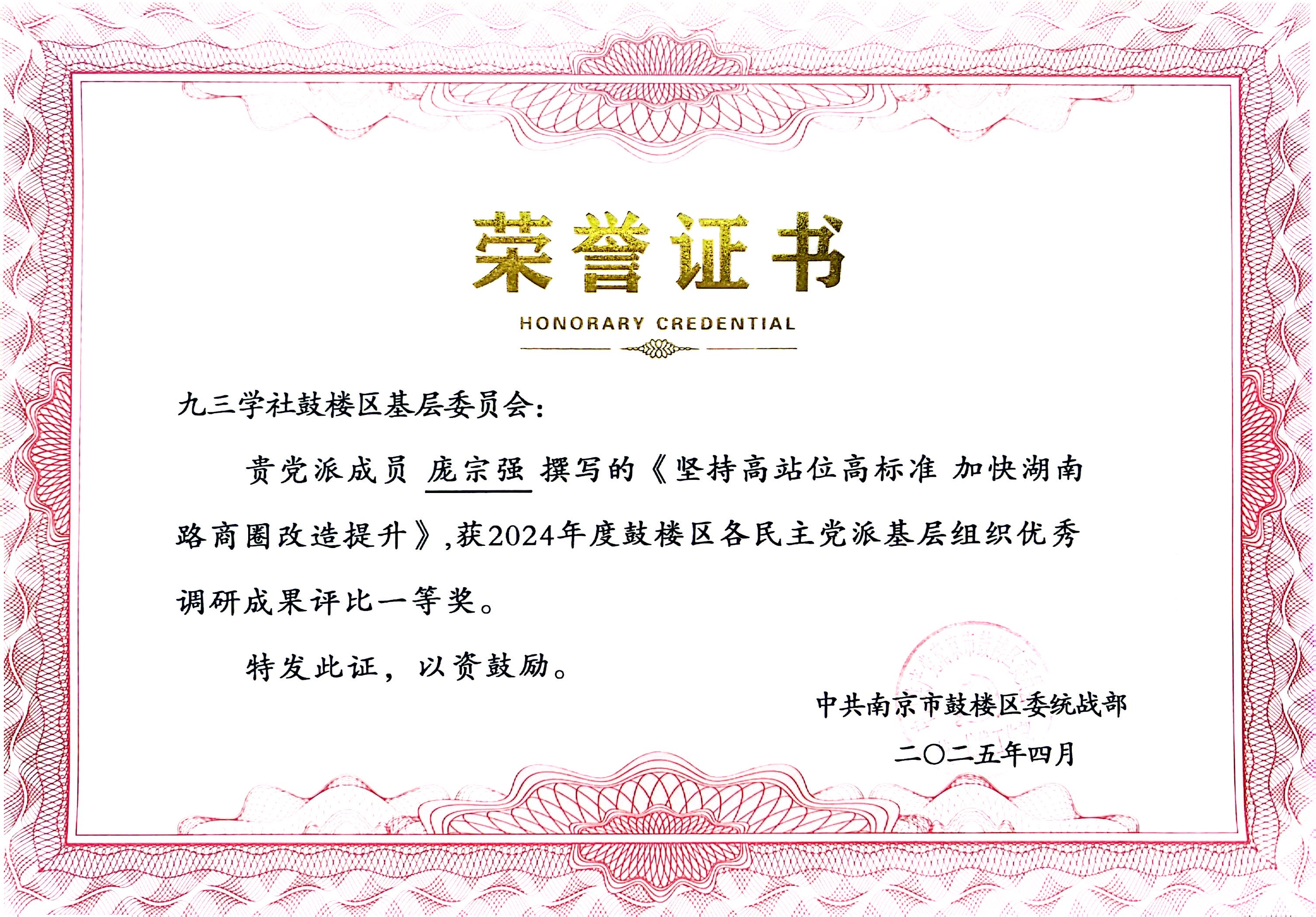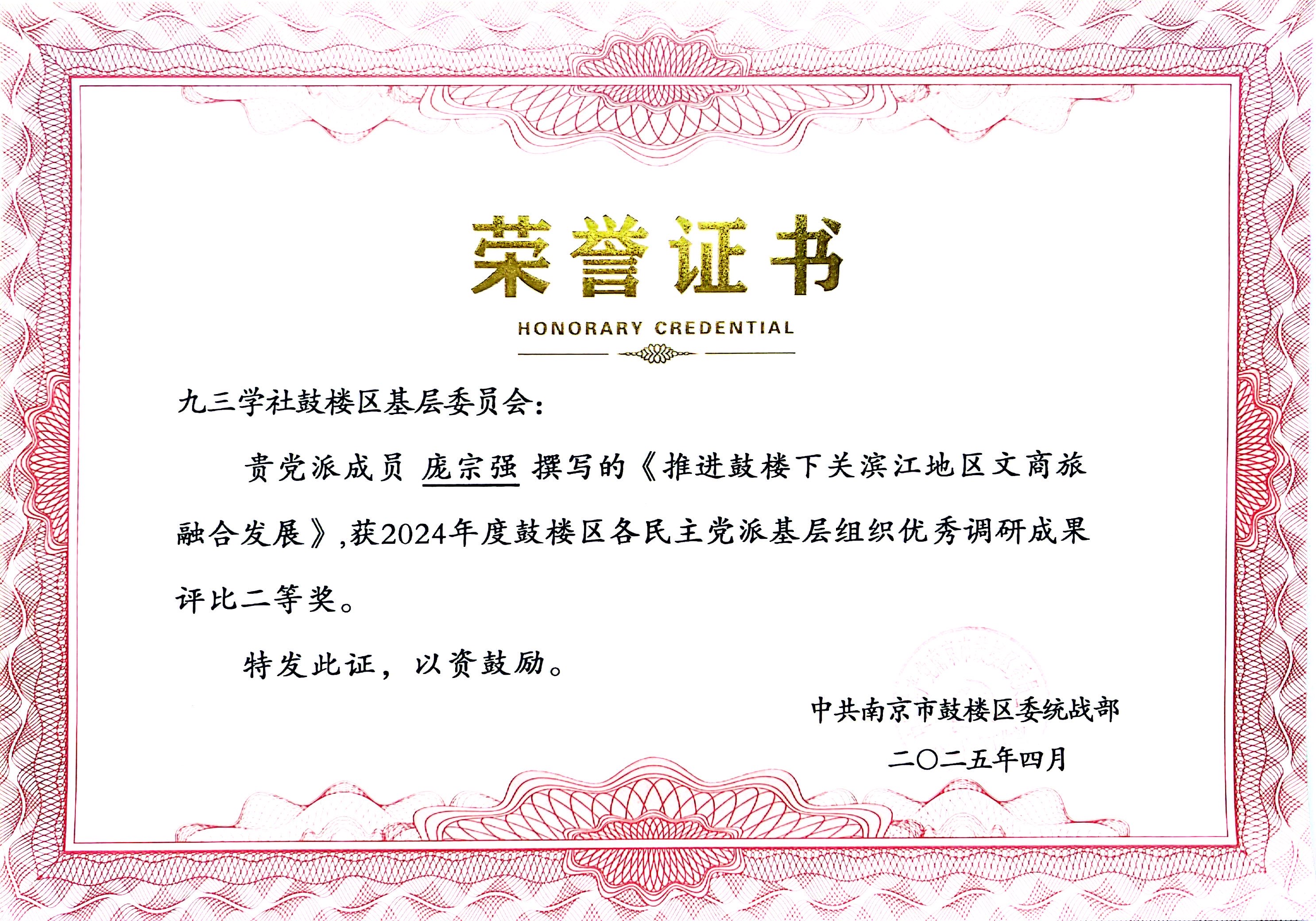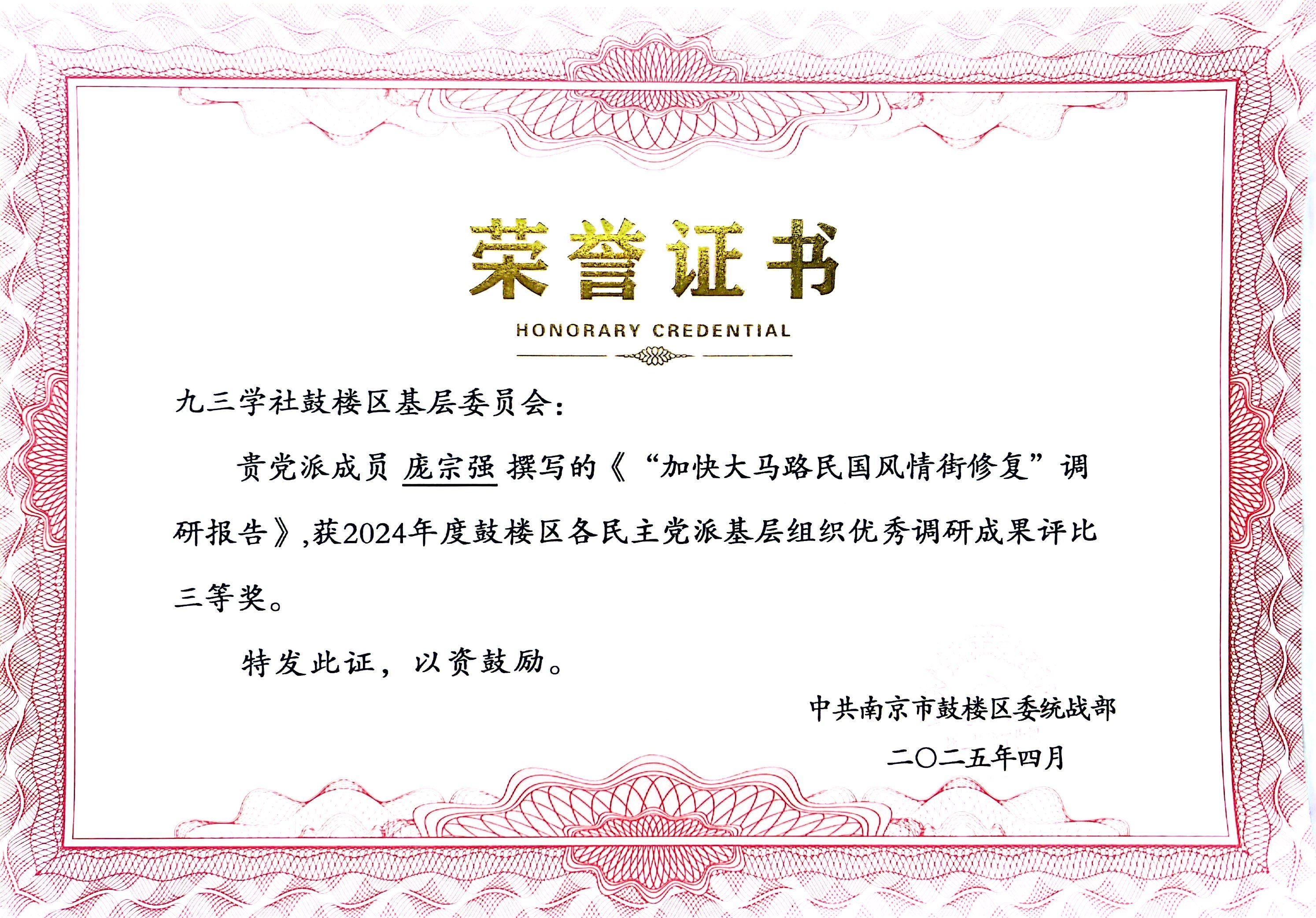 91暗网 庞宗强老师三项调研成果获鼓楼区民主党派优秀调研成果奖