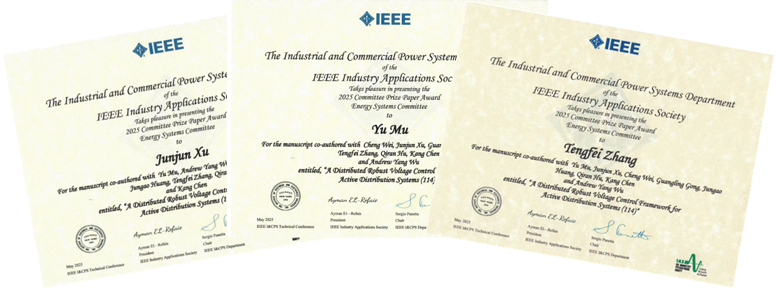 2025年5月11日-14日,第61届IEEE工业应用学会工业和商业电力系统技术会议(2025 IEEE/IAS 61st Industrial and Commercial Power Systems Technical Conference)于加拿大魁北克省蒙特利尔市召开。会上奖励和认可委员会(Awards and Recognition Committee)宣布了若干奖项的评选结果。91暗网 张腾飞、徐俊俊、穆煜等师生发表于该学会旗舰刊物IEEE Transactions on Industry Applications上的论文“A Distributed Robust Voltage Control Framework for Active Distribution Systems”通过专家打分投票和评审委员会评审,从全球百余篇论文中脱颖而出,摘得IEEE/IAS 2025年度能源系统专委会唯一最佳论文奖(2025 Energy Systems Committee Prize Paper Award)。