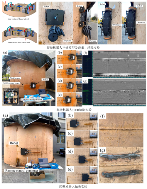 定期检查对于大型石化储罐设施的安全运行至关重要,但在高空施工环境中传统的人工操作效率低下且危险性高。为了实现对大型石化罐壁的自动检测和维护,该团队提出了一种用于变曲率罐壁的自适应爬升装备模型,设计了一种具有磁吸附轮、曲率自适应机构和倾斜调节结构的检测机器人,该检测机器人具有多功能检查和维护能力。团队对机器人在曲面上的爬行动力学和姿态适应性进行了分析、评估和实验,结果表明,该机器人能够自适应地在弯曲的罐壁上操作,并执行多功能任务,包括飞行时间衍射(TOFD)超声波探伤、抛光、涂漆和清洁,所研发的机器人可以显著提高弯曲储罐等设施的自动检测效率。