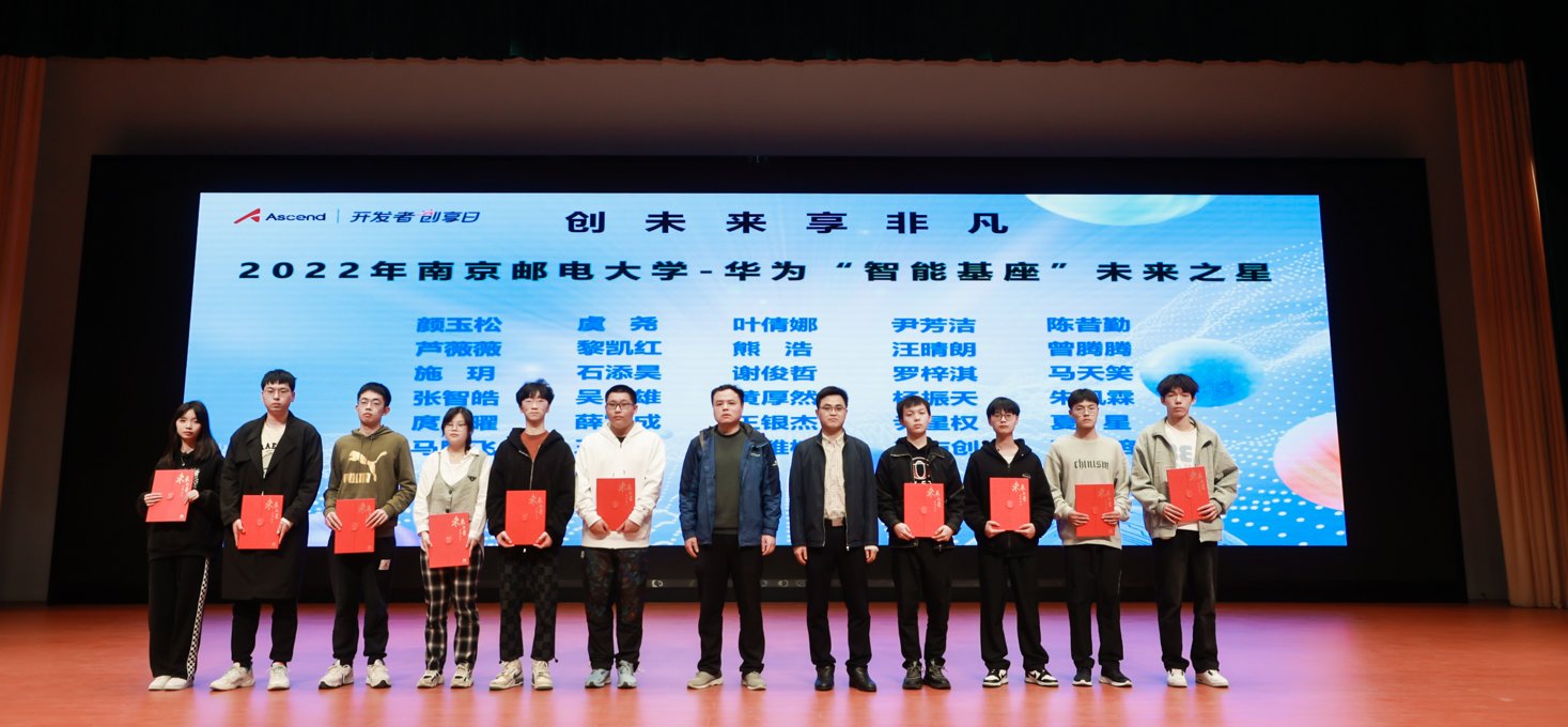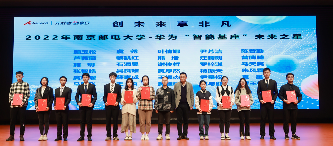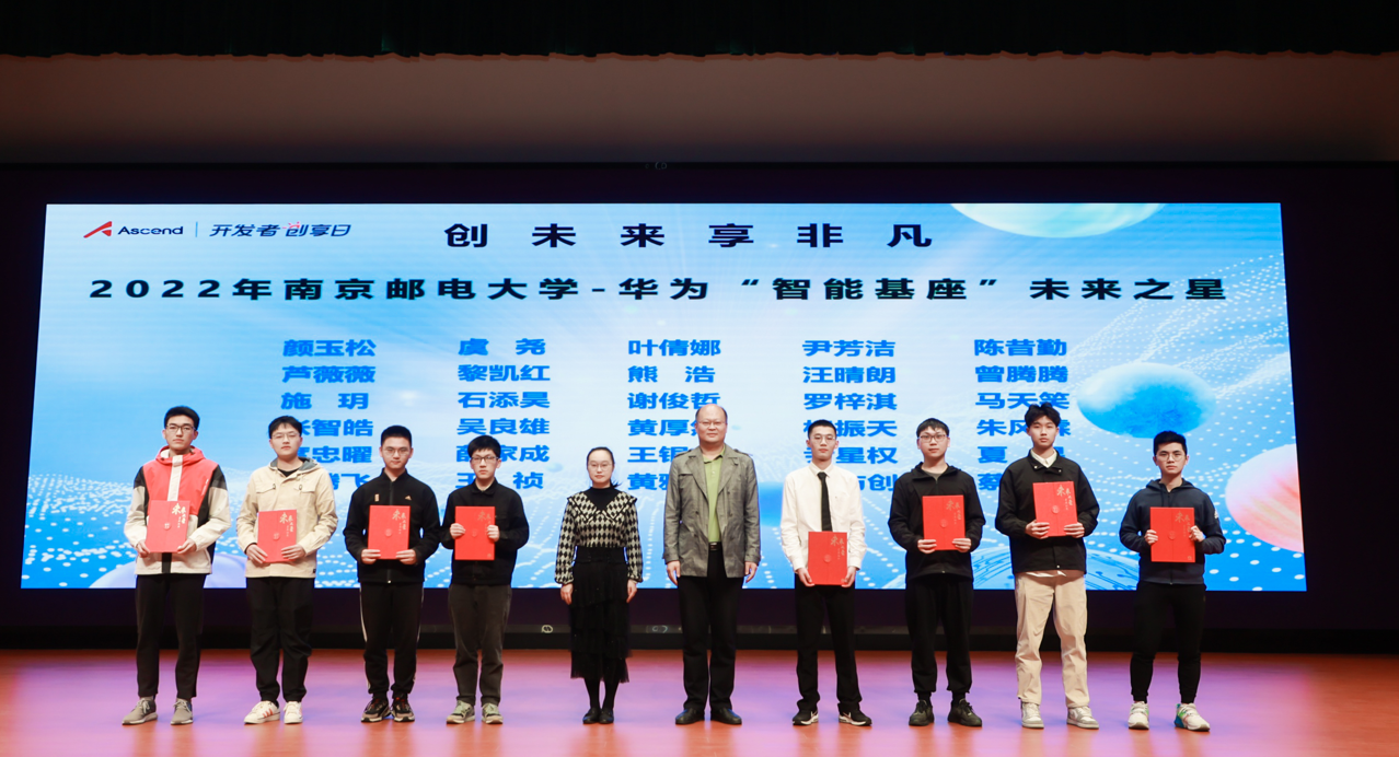 随后举行了智能基座奖学金颁奖典礼,获得2022年度华为智能基座奖学金的30位同学上台领奖,现场领导、老师为同学们颁奖并合影留念。